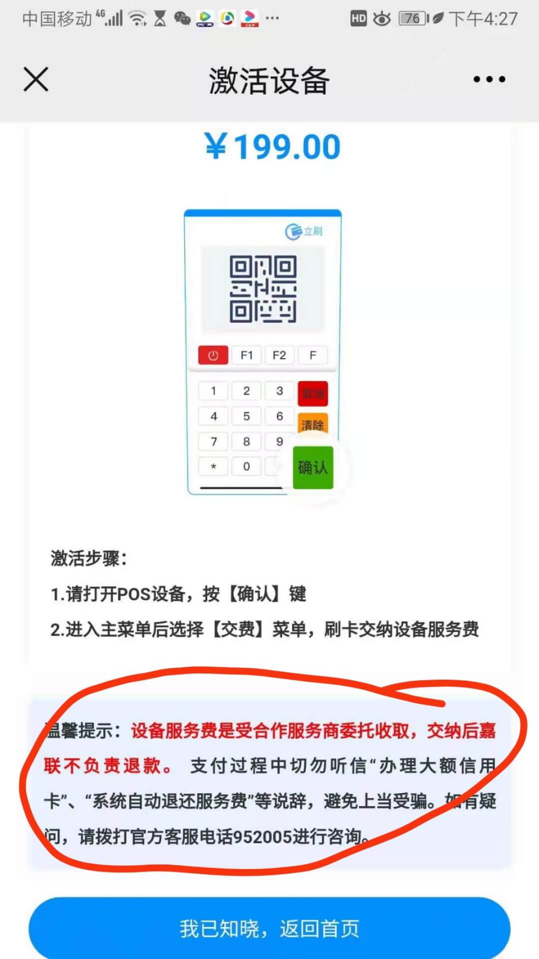 繳納服務(wù)費激活:立刷電簽版服務(wù)費有多個檔次,分別為0元激活服務(wù)費、49元激活服務(wù)費、69元激活服務(wù)費、99元激活服務(wù)費、199元激活服務(wù)費、249元激活服務(wù)費、具體的服務(wù)費金額是根據(jù)立刷電簽版POS機機具所屬代理商進(jìn)行設(shè)置的,換句話來說也就是服務(wù)費并不是必須要繳納的,但是用戶一旦繳納服務(wù)費,將無法以任何形式退還。請千萬不要相信有些底層代理商所說的,3個月之后返還服務(wù)費或者1年之后返還服務(wù)費之類的話,這些都是騙人的,只是誘騙用戶繳納服務(wù)費。